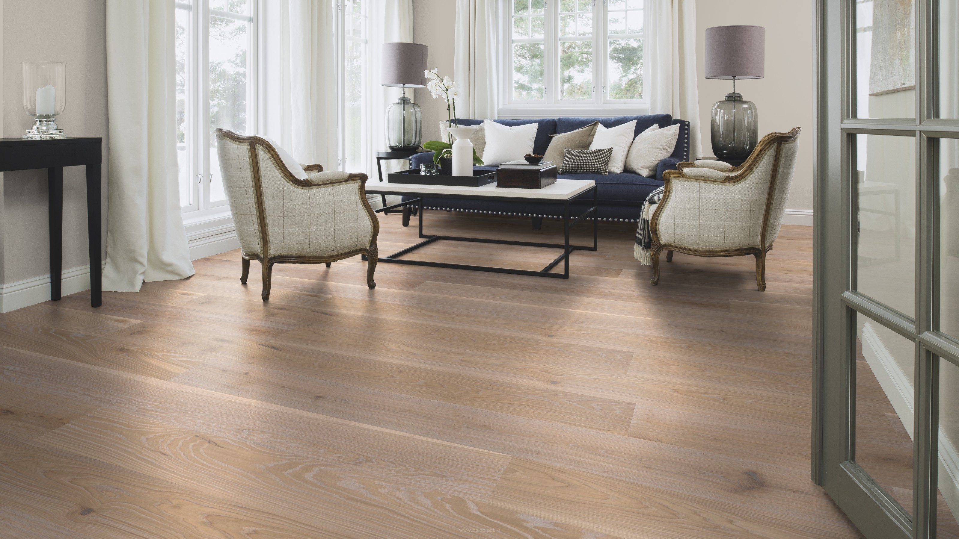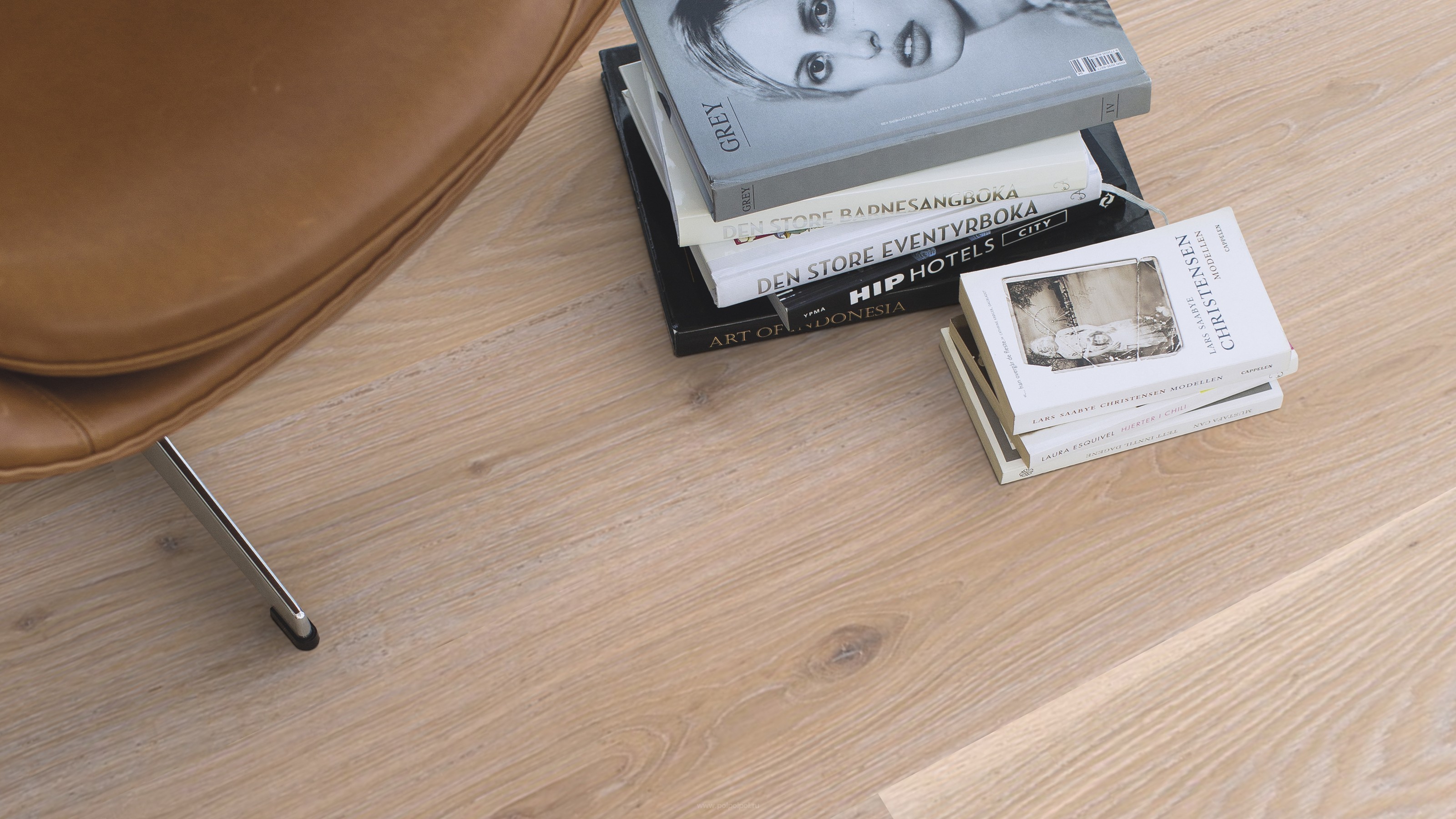 Дубовые доски с очень глубокой брашировкой с наполненными черными наполнителем сучками и фаской с длинных сторон. Белое натуральное масло проникает глубоко в брашированную структуру древесины и создает светлый вид поверхности.