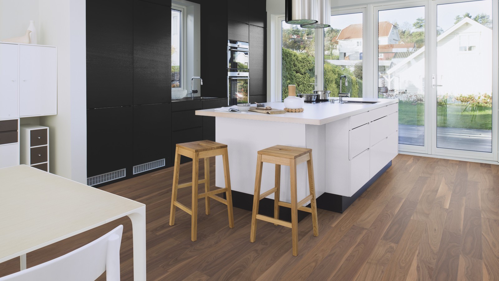 Однополосная паркетная доска Орех Американский, фаска, покрытие Live Pure. Благодаря специальной обработке напольного покрытия, Live Pure представляет собой поверхностный слой, который защищает пол от пыли, грязи, жидкостей и химических веществ, хотя в то же время пол выглядит и ощущается как необработанная или отшлифованная сырая древесина. Поверхность, обработанная Live Pure, также отличается лучшей устойчивостью к УФ лучам, чем стандартные покрытия из лака и масла. После укладки пола и во время его использования не требуется никакой дополнительный уход.