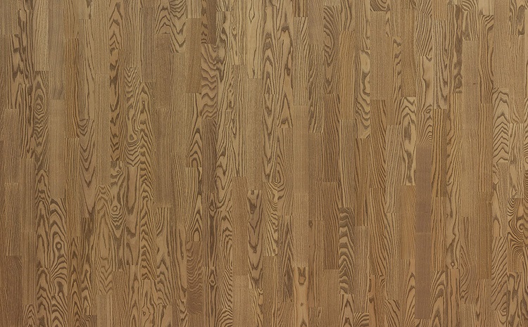 Легко брашированная трехполосная доска из ясеня, покрыта бежевым маслом.