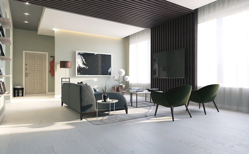 Классическая трехполосная доска из дуба робуста под молочно-белым матовым лаком.